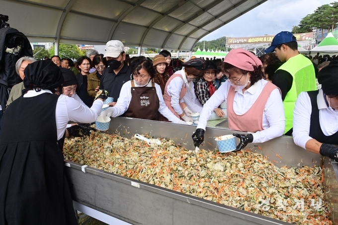 이번 퍼포먼스는 봉화의 대표 농·축산물인 송이버섯과 한약우를 주재료로 활용해 500인분 규모의 대형 비빔밥을 조리해 관광객과 군민들에게 나누는 행사로, 축제의 서막을 화려하게 열었다.