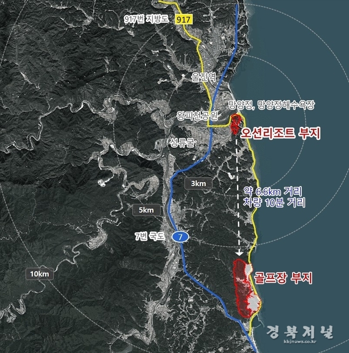 ‘울진군 오션리조트 및 골프장 개발사업’대상지는 근남면 산포리 697-4 일원 약18만㎡, 매화면 오산리 산200번지 일원 약 134㎡ 이다.