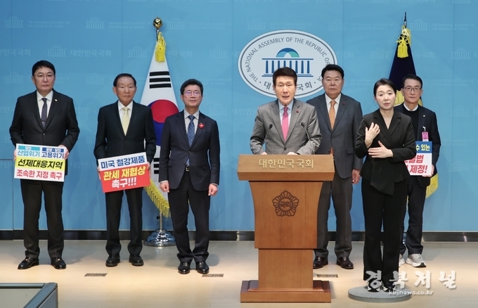 K-스틸법을 공동대표발의한 이상휘(포항 남·울릉)·어기구(충남 당진) 국회의원과 김정재(포항 북)·권향엽(전남 광양) 국회의원, 이강덕 포항시장, 정인화 광양시장, 오성환 당진시장, 나주영 포항상의 회장, 우광일 광양상의 회장, 신현덕 당진상의 회장은 12일 서울 국회 소통관에서 공동 기자회견을 열고 ‘대미 철강제품 관세 재협상 및 K-스틸법 실질적인 시행령 마련을 위한 여야정 범정부 차원의 공동대응 호소문’을 발표했다.