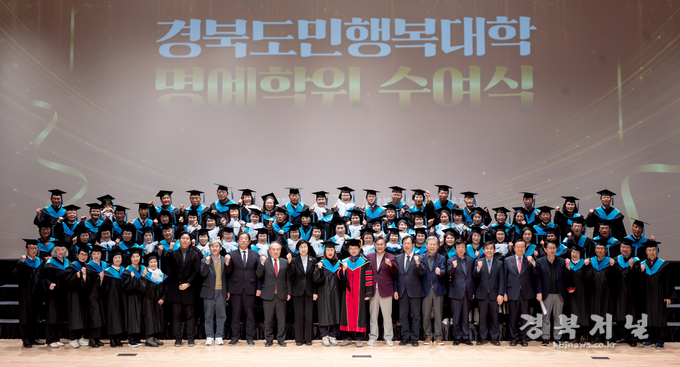 경상북도는 24일 도청 동락관에서 경북도민행복대학 21개 시군 캠퍼스(학사) 및 6개 대학캠퍼스(석·박사) 관계자 등 600여 명이 참석한 가운데, 학사 866명, 석사 142명, 박사 60명 등 총 1,068명에 대한 ‘경북도민행복대학 명예학위 수여식’을 개최했다.