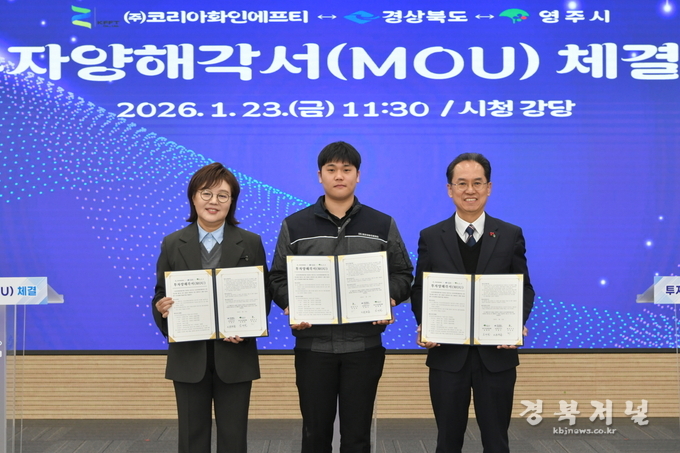 영주시는 23일 시청강당에서 ㈜코리아화인에프티, 경상북도와 함께 건강기능식품 제조공장 설립을 위한 투자양해각서(MOU)를 체결했다.