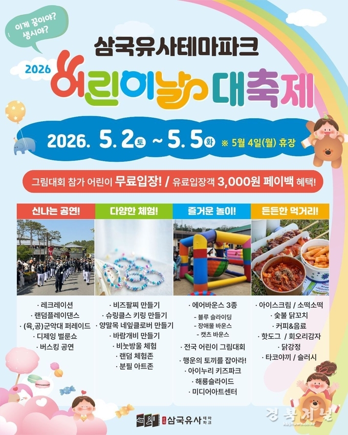 군위문화관광재단은 “아이들에게 가장 완벽한 어린이날을 선물하기 위해 5월 4일은 철저한 시설 점검과 재정비를 진행할 예정”이라며, “운영되는 3일 동안 모든 가족이 꿈같은 추억을 만들 수 있도록 최상의 서비스를 준비하겠다”고 전했다.