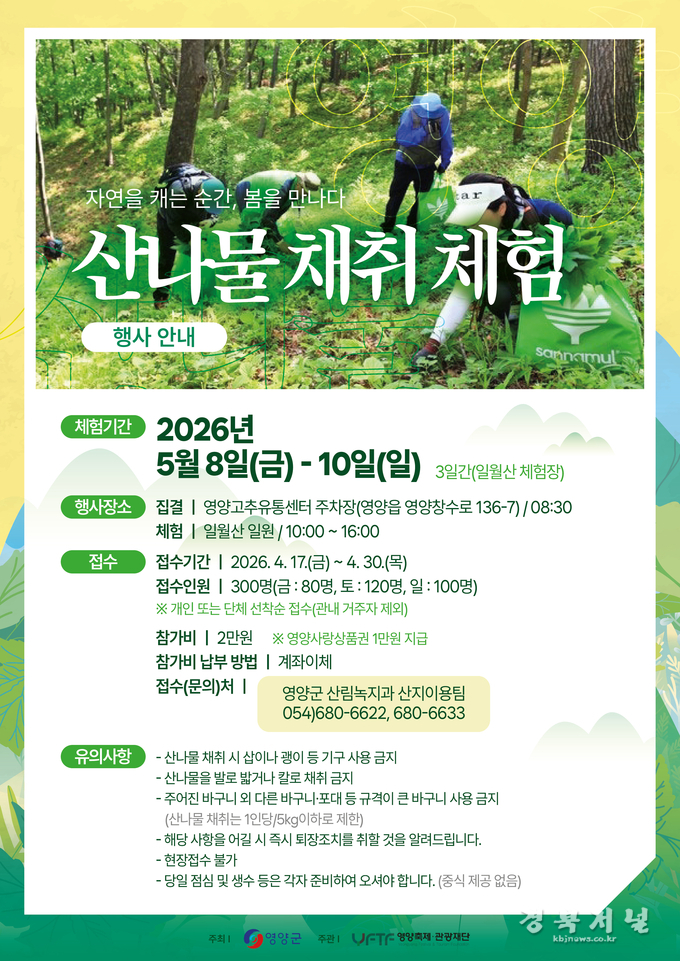 영양군 관계자는 “산나물채취체험행사는 자연 속에서 직접 봄을 느낄 수 있는 대표 체험 프로그램으로, 영양산나물축제를 더욱 풍성하게 만드는 중요한 콘텐츠”라며 “참가자들이 일월산의 자연을 체험하며 산나물의 매력을 직접 느낄 수 있기를 기대한다”라고 밝혔다.