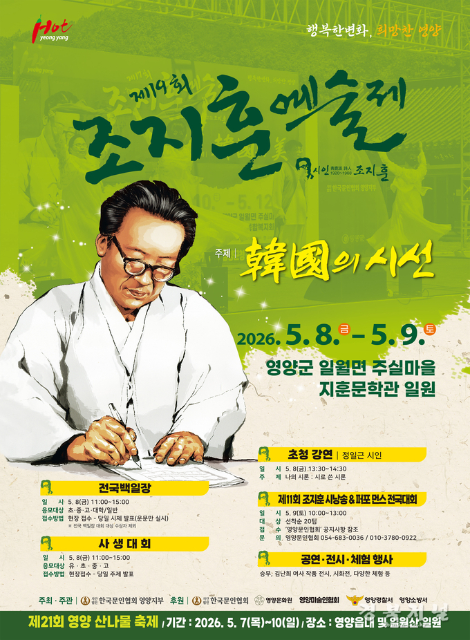영양군 관계자는 “조지훈 예술제는 문향의 고장 영양을 대표하는 종합문화예술 행사로, 문학과 예술을 통해 군민과 방문객이 함께 공감하고 소통하는 뜻깊은 시간이 될 것”이라며 “가족 단위 방문객들이 함께 참여하고 즐길 수 있는 행사로 준비한 만큼 많은 관심과 참여를 바란다”라고 밝혔다.