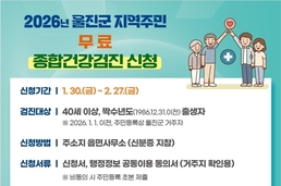 울진군은 한국수력원자력(주)의 지원을 받아 2025년에 이어 2026년에도 지역주민을 대상으로 종합건강검진을 실시한다. 이번 건강검진은 울진군 인구의 약 10%에 해당하는 4,630명을 대상으로 하며, 신청 기간은 1월 30일부터 2월 27일까지다. 신청대상은 2026년 1월 1일 이전부터 주민등록상 울진군에 거주 중인 군민 가운데 40세 이상(1986년 12월 31일 이전 출생자) 짝수년도 출생자다. 검진은 울진군의료원, 강릉아산병원, 포항성모병원에서 진행되며 검진 항목은 25종 80여 개 항목으로 국가암검진과 병행하여 실시한다. 검진을 희망하는 군민은 신분증을 지참하여 2월 말까지 주소지 읍면 사무소에 신청하면 된다. 신청서류는 신청서와 거주지 확인용(행정정보공동이용사전)동의서이며, 비동의시 주민등록초본을 제출해야 한다. 군은 2월 말까지 대상자 신청이 완료되면 3월 초에 한수원 지원 종합검진 미수검자, 고령자, 취약계층 순서로 대상자를 선정한 후 주민과 협약병원에 통보할 예정이다. 건강검진은 3월 16일부터 연말까지 진행된다. 울진군 관계자는“많은 울진군민이 종합건강검진으로 질병을 조기발견하여 평생건강을 유지하는 기회가 되기를 바란다”며“군민의 건강권