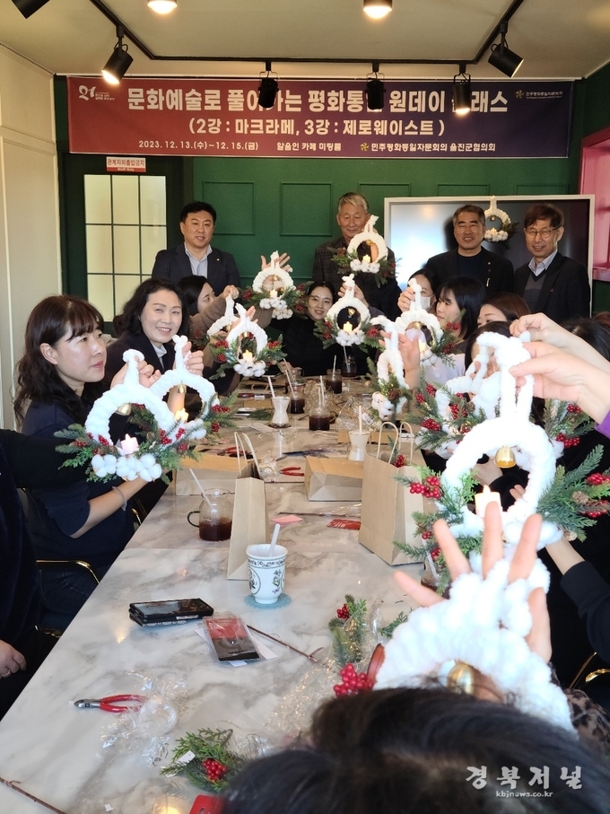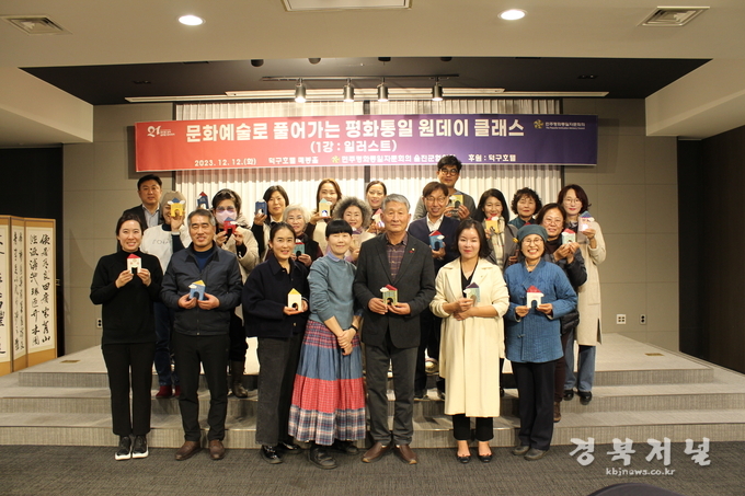 민주평화통일자문회의 울진군협의회(회장 이선욱)는 문화예술 활동으로 평화통일 이야기를 풀어내고, 참여와 주도적 평화통일 인식을 창작활동으로 넓혀가고자 12월 12일(1강), 12월 13일(2강), 12월 15일(3강) 10:30분 덕구호텔 매봉홀과 알움인 카페 미팅룸에서 문화예술로 풀어가는 평화통일 원데이 클래스를 개최하였다.