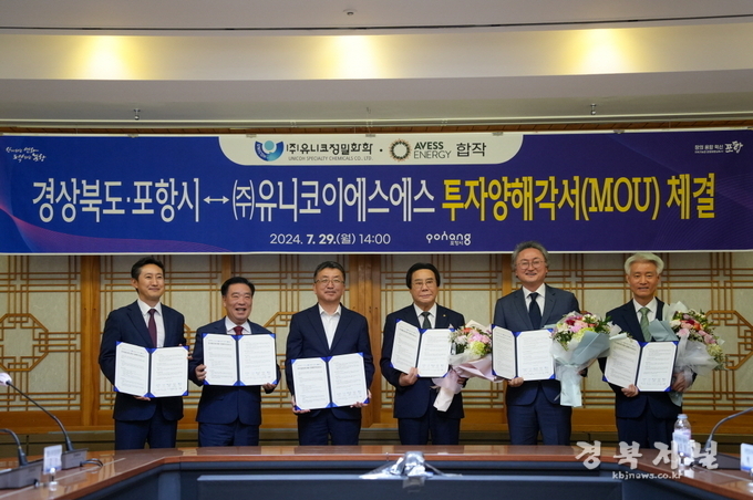 포항시와 경상북도는 29일 포항시청 중회의실에서 ㈜유니코정밀화학·호주 AVESS에너지·㈜유니코이에스에스와 바나듐 레독스 흐름 배터리(VRFB) 전해질 생산 투자양해각서를 체결했다.