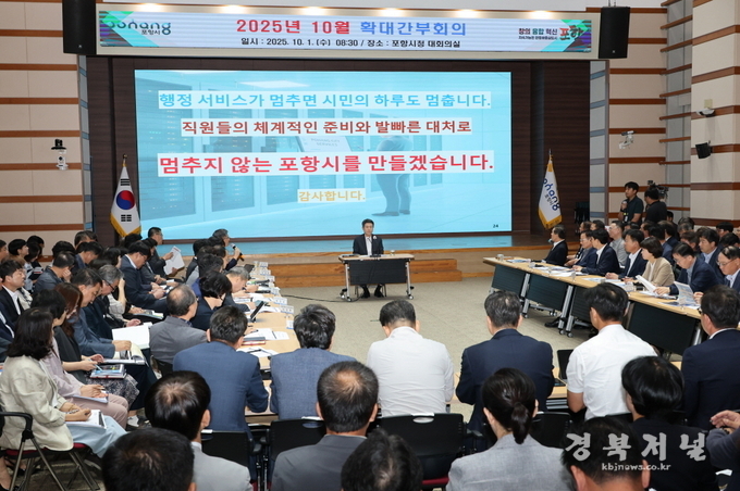이강덕 포항시장은 1일 시청 대회의실에서 열린 10월 확대간부회의를 주재하며 추석 연휴를 앞두고 민생 안정과 지역 경제 활성화를 위해 현안업무에 만전을 기해 줄 것을 당부했다.