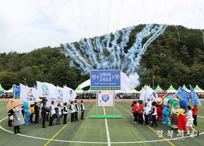 행사는 ‘남북9축, 함께 잇다’ 슬로건 아래 강원·경북 10개 시, 군 대표단이 운동장 양 끝에서 동시에 출발, 중앙에 위치한 제막무대에서 하나로 모여 ‘남북9축 고속도로’ 표지판을 공동 제막하는 순으로 진행됐다.