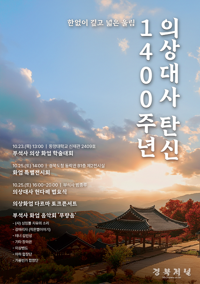 조종근 문화예술과장은 “이번 의상대사 탄신 1400주년 기념행사는 그의 사상을 재조명하고, 화엄의 세계관을 현대적으로 해석하는 학문적·문화적 의미를 지닌 자리가 될 것”이라며 “의상대사가 창건하신 부석사에서 행사를 개최하게 되어 매우 뜻깊으며, 시민과 관광객이 함께하는 의미 있는 문화축제가 되길 바란다”고 말했다.