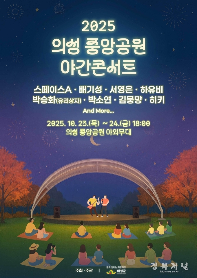 의성군(군수 김주수)은 지난 7월 1일 개원한 도심 속 힐링공간 ‘의성 중앙공원’에서 오는 23일부터 24일까지 양일간 오후 6시에 ‘2025 의성 중앙공원 야간콘서트’를 개최한다고 밝혔다.