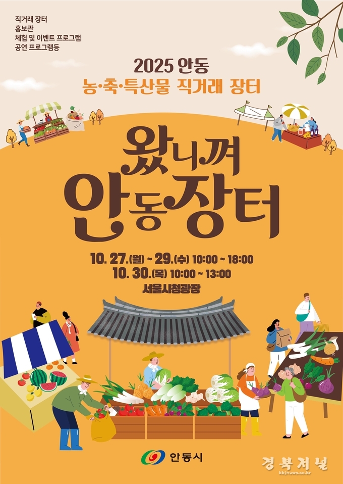 안동시(시장 권기창)는 10월 27일(월)부터 10월 30일(목)까지 4일간, 서울시청 앞 서울광장에서 ‘2025 왔니껴안동장터’를 개최한다.