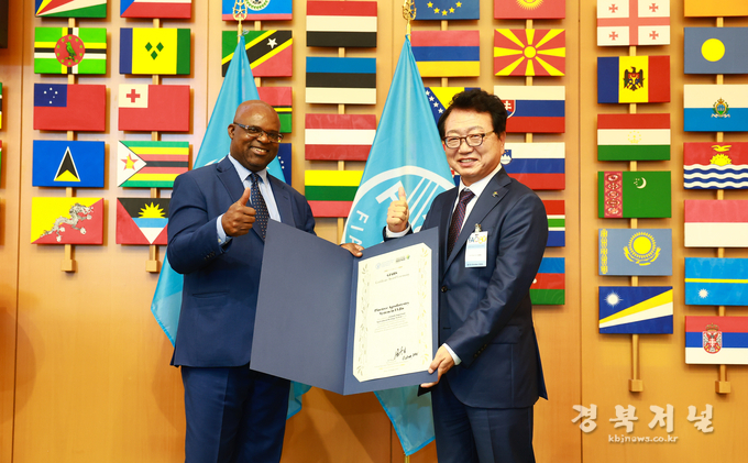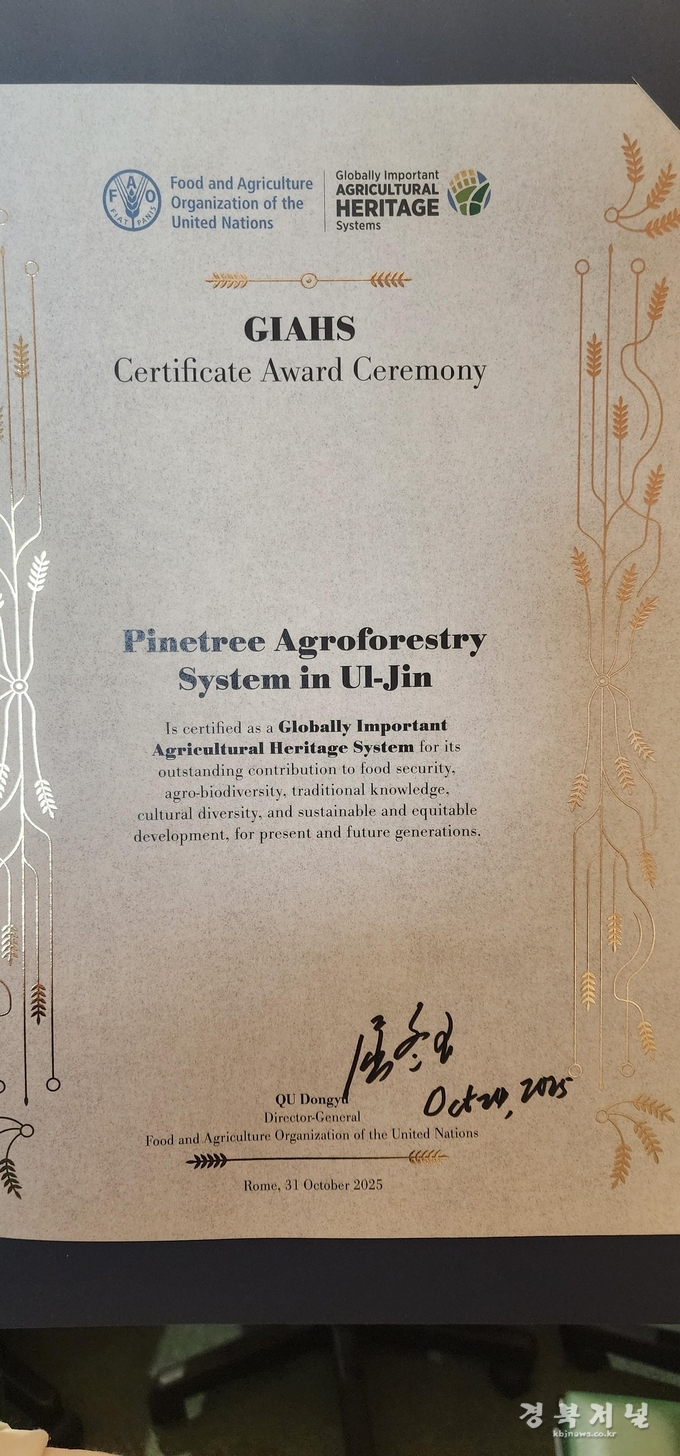 지난 10월 31일(현지시간) 이탈리아 로마 FAO 본부에서 열린 인증서 수여식에서 울진군 대표단이 참석해 공식 인증서를 전달받았다.