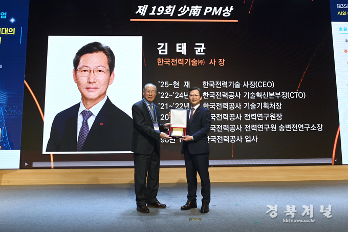한국전력기술(사장 김태균, 이하 ‘한전기술’) 김태균 사장은 지난 7일 한국과학기술회관에서 한국프로젝트경영협회(KPMA) 주관으로 개최된 제35회 PM심포지엄에서 「제19회 少南PM상」을 수상했다.