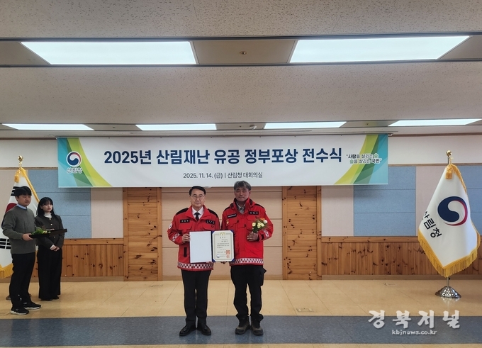 영덕군 산불진화대장 김영수(58)씨가 14일 산림청에서 열린 ‘2025년 산림재난 유공자 포상식’에서 대통령 표창을 받았다.