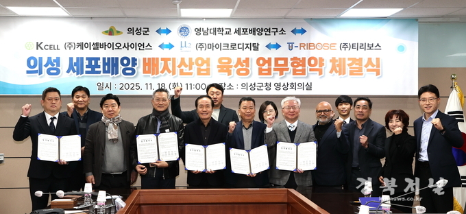 의성군(군수 김주수)은 11월 18일 영남대학교 세포배양연구소(소장 최인호), ㈜케이셀바이오사이언스(대표 강기용), ㈜마이크로디지탈(대표 김경남), ㈜티리보스(대표 윤형호)와 함께 세포배양 배지 산업 육성을 위한 5자 업무협약(MOU)을 체결했다.