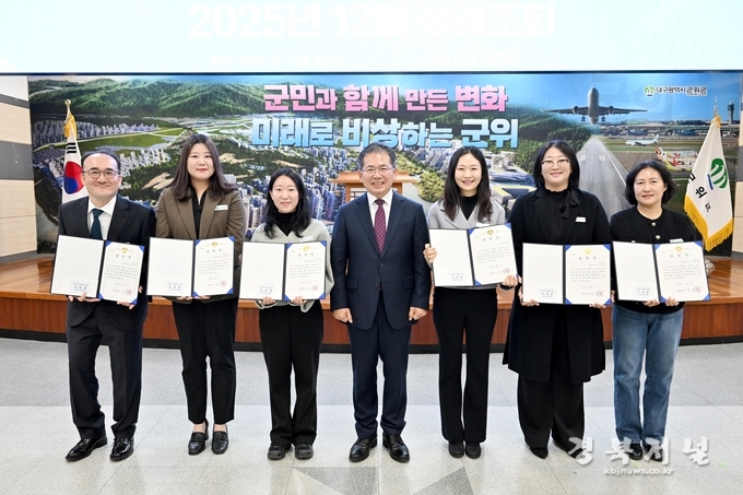 군위군은 지난 1일 열린 12월 정례조회에서 2025년도 군위군 친절부서 3개 부서와 친절공무원 6명을 선정하여 포상했다.