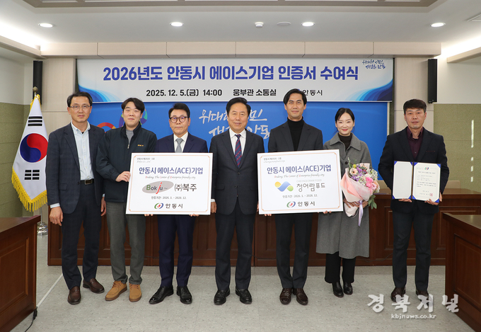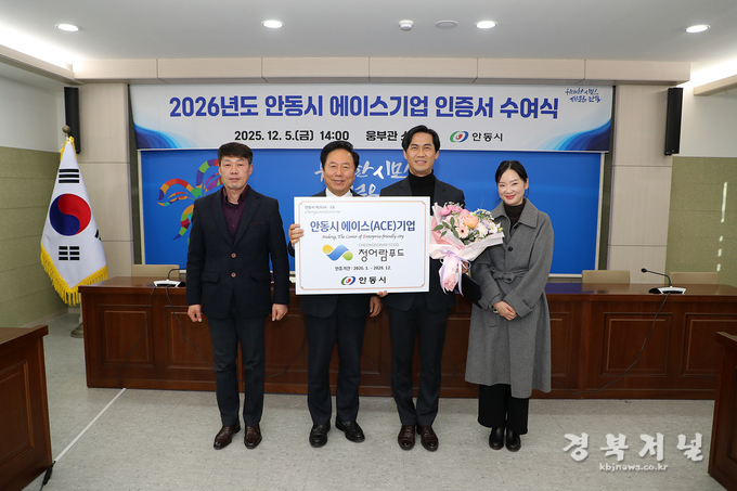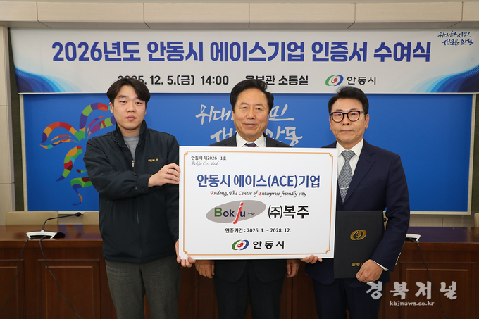 안동시는 ㈜복주(대표 권귀순), 농업회사법인 ㈜청어람푸드(대표 우수우) 2개 기업을 ‘2026년 안동시 에이스(ACE)기업’으로 선정하고 12월 5일(금) 안동시청 소통실에서 인증서와 현판을 수여했다.