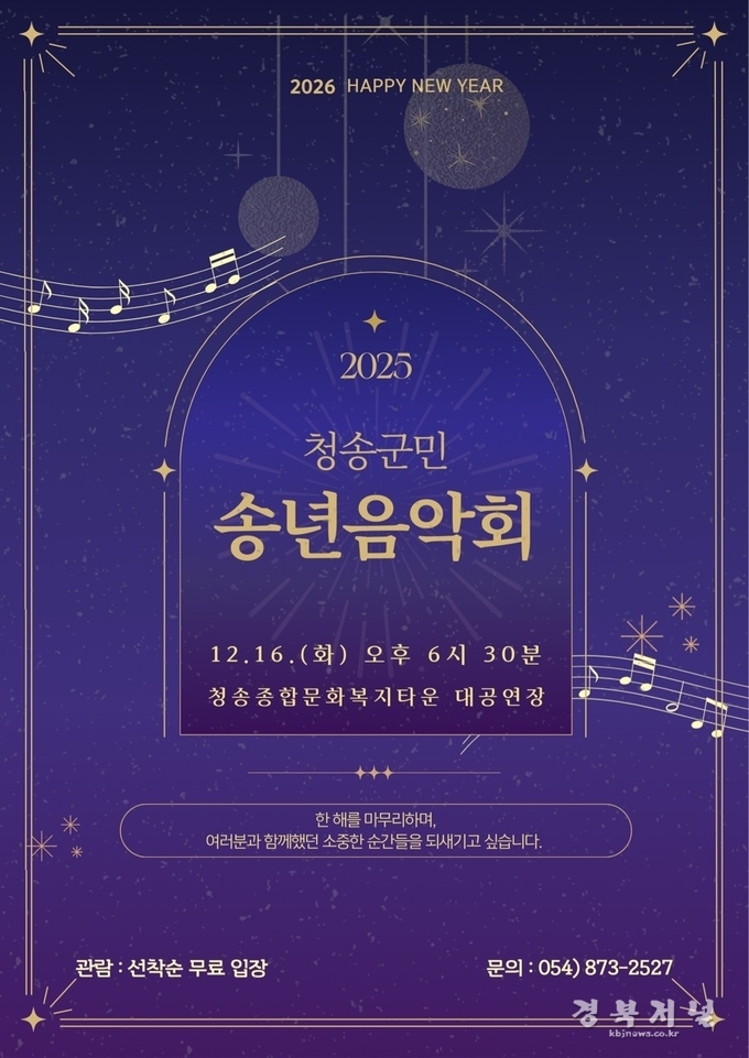 청송군 관계자는 “이번 공연이 군민 여러분께 올 한 해를 되돌아보고 서로를 격려하는 따뜻한 시간이 되길 바란다.”며, “2025년을 잘 마무리하고, 다가오는 2026년 병오년을 희망과 기대 속에 맞이하는 뜻깊은 행사가 되기를 바란다.”고 전했다.