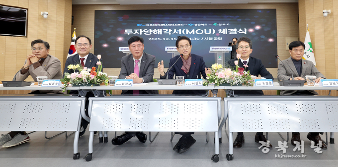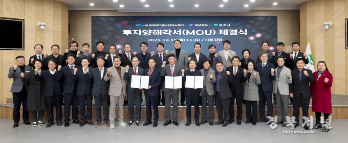경상북도와 영주시는 15일 영주시청 강당에서 이철우 경상북도지사, 유정근 영주시장 권한대행, 임종득 국회의원, 박성만 경북도의회 의장, 김병기 영주시의회 의장, 정정모 ㈜코리아디펜스인더스트리 대표 등 20여 명이 참석한 가운데 ㈜코리아디펜스인더스트리와 경상북도·영주시 간 투자양해각서(MOU)를 체결했다.
