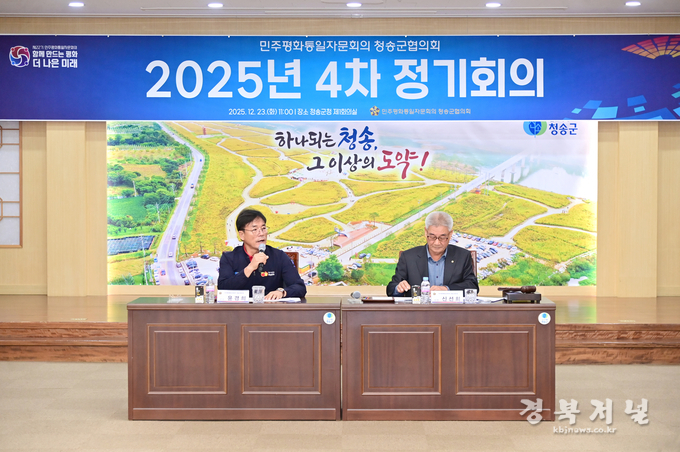 민주평화통일자문회의 청송군협의회(회장 신선희)는 지난 23일 청송군청 제1회의실에서 대행기관장인 윤경희 청송군수, 자문위원 등 30여 명이 참석한 가운데 ‘화해·협력의 남북관계 재정립을 위한 정책 방향’이라는 주제로 2025년 4분기 정기회의를 개최했다.