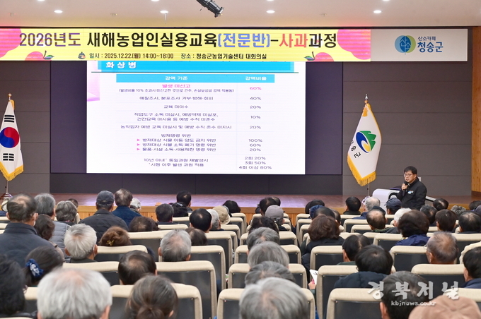 청송군(군수 윤경희)은 지난 22일부터 24일까지 3일간 청송군농업기술센터 대회의실에서 실시한 ‘2026년도 새해농업인 실용교육(전문반)’을 성황리에 마무리했다고 밝혔다.