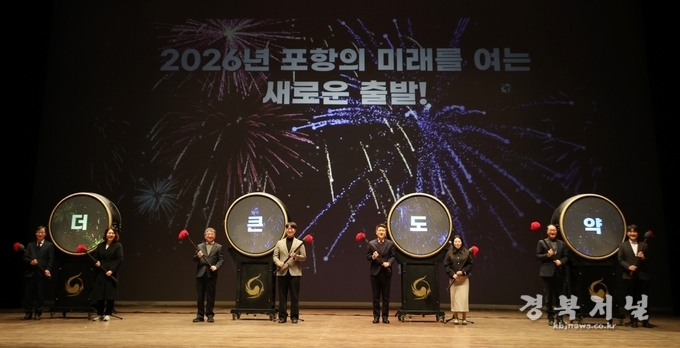 특히 이날 시무식의 핵심 프로그램으로 마련된 미디어 대북 퍼포먼스 ‘포항의 새해, 시민을 향한 첫 약속’은 LED 미디어북을 활용해 새해의 포부와 시민을 향한 약속, 2026년을 여는 도약의 메시지를 상징적으로 표현하며 직원들의 공감을 이끌어냈다.