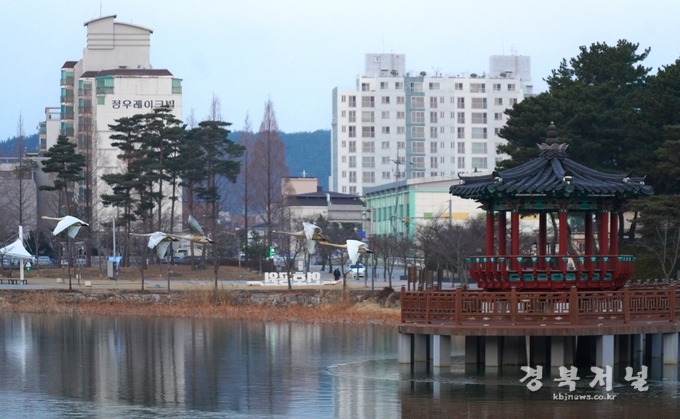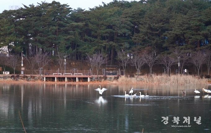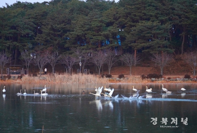 맑게 갠 하늘 아래 울진군 연호공원에서 겨울 철새 고니가 힘차게 날아오르고 있다.