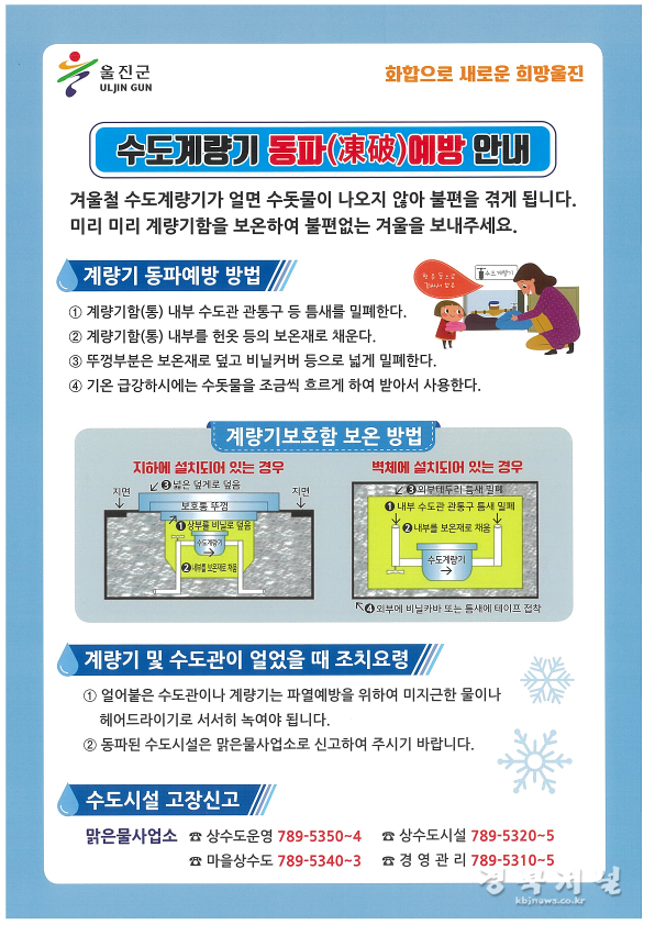수도계량기 또는 수도관 동파 등 급수시설에 문제가 발생했을 경우에는 울진군 맑은물사업소(☎054-789-5300)로 신고하면 신속한 조치를 받을 수 있다.