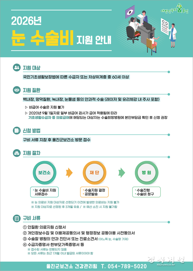 울진군은 60세 이상 저소득층 어르신을 대상으로 2026년 백내장 등 눈 수술비 지원사업을 추진해 노년기 시력 보호와 의료비 부담 완화에 나선다.