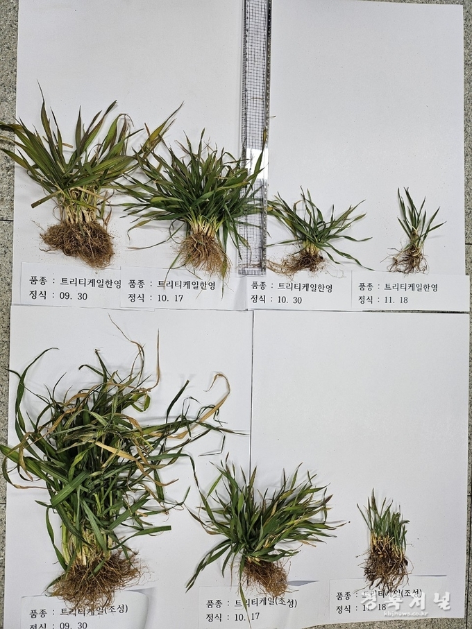 이번 시험은 조사료용 트리티케일 품종인 ‘한영’과 ‘조성’을 중심으로, 기존에 널리 재배되고 있는 이탈리안그라스와 호맥을 대조구로 설정해 파종 시기를 달리하며 진행되고 있다.