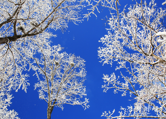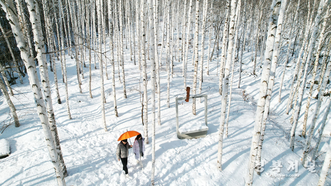 맑은 계곡을 따라 걷다 보면, 새하얀 눈이 소복이 내려앉은 자작나무들이 빽빽이 들어선 숲이 모습을 드러낸다.