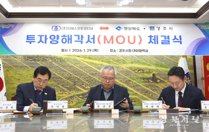 경주시는 29일 시청 대외협력실에서 경북도와 함께 자동차 차체 부품 전문기업 ㈜티에스오토모티브 간 전기차 신차종 제품 생산라인 구축을 위한 투자양해각서(MOU)를 체결했다.