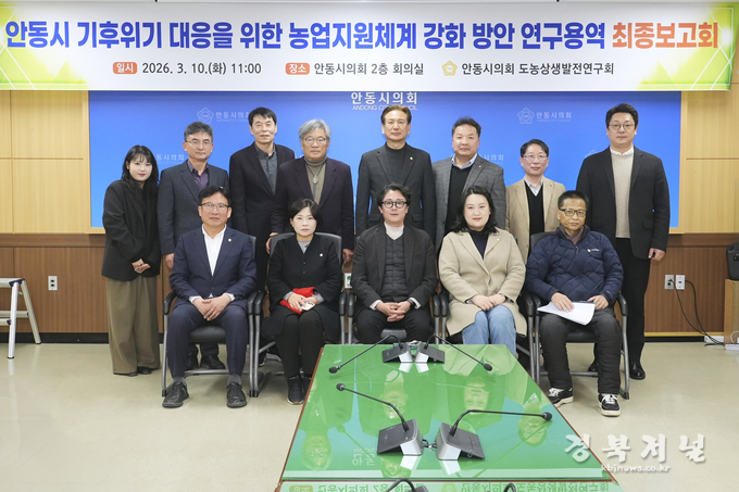 안동시의회 의원연구단체 도농상생발전연구회(회장 김창현 의원)는 10일 안동시의회 2층 회의실에서 연구회원과 집행부 관계자 등 20여 명이 참석한 가운데 「안동시 기후위기 대응을 위한 농업지원체계 강화 방안 연구」 용역 최종보고회를 개최했다.