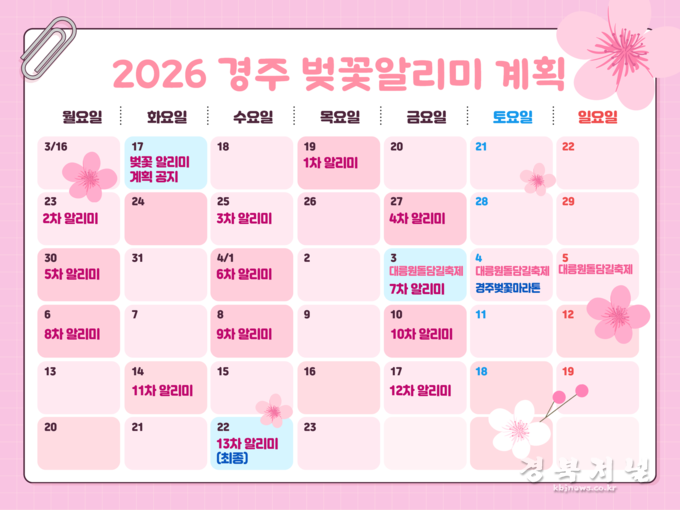 경주시는 2026년 봄을 맞아 문화관광 누리집을 통해 주요 벚꽃 명소의 개화 현황을 실시간으로 제공하는 ‘벚꽃알리미’ 서비스를 운영한다고 22일 밝혔다.