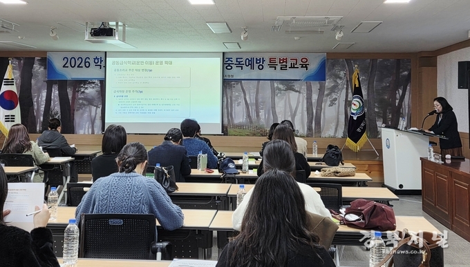 경상북도울진교육지원청(교육장 이기협)은 3월 25일(수) 15시 3층 대회의실에서 관내 초, 중, 고등학교 영양교사 및 영양사 21명을 대상으로 2026년 학교급식 기본방향 전달 및 식중독 예방 특별교육을 실시하였다.