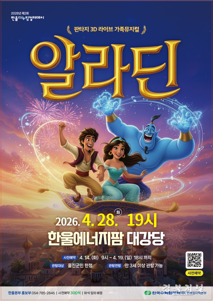 한국수력원자력(주) 한울원자력본부(본부장 이세용, 이하 한울본부)는 4월 28일 19시 한울에너지팜 대강당에서 제2회 ‘한울다누림컬쳐데이’ 아동 뮤지컬 「알라딘」을 개최한다.
