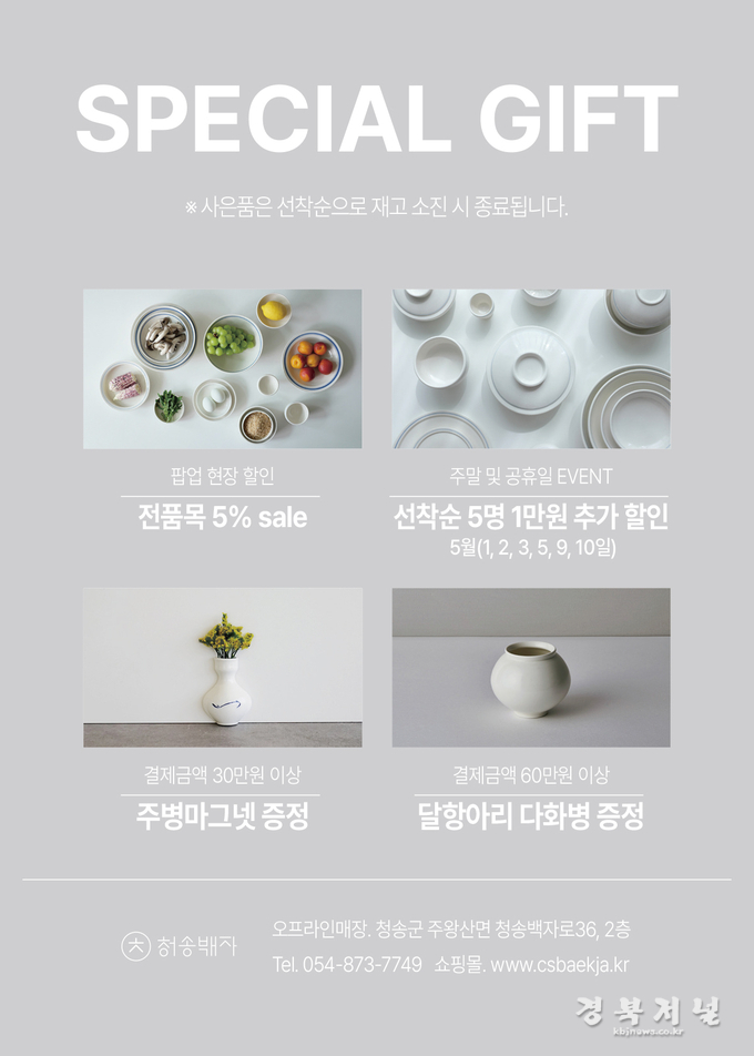 행사기간 동안 전품목 5% 할인 혜택이 제공되며, 일정 금액 이상 구매 고객에게는 청송백자 주병 마그넷과 달항아리 다화병 등 사은품이 증정된다.