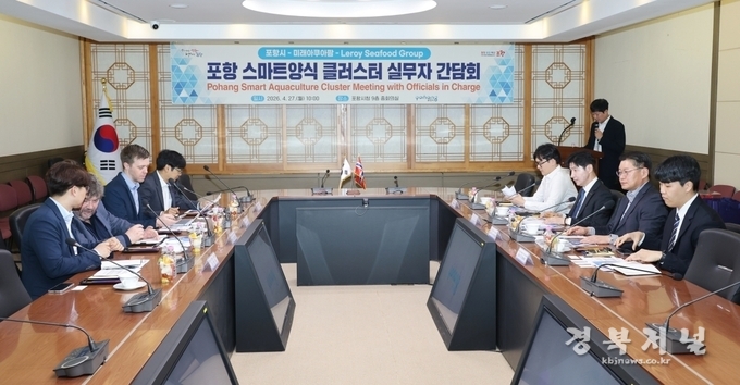 포항시는 27일 시청 중회의실에서 노르웨이 세계 3위 연어 생산기업 리로이 씨푸드 그룹(Lerøy Seafood Group) 및 미래아쿠아팜 관계자들이 참석한 가운데 ‘포항 연어 스마트양식 클러스터 사업’ 협력을 위한 실무자 간담회를 갖고, 사업 현장을 방문했다.