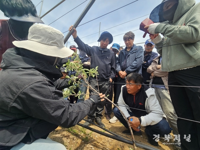 이날 현장 교육에는 지역에서 사과를 재배하거나 이를 준비하는 농업인 80여 명이 참여해 다축형 사과 재배에 대한 열띤 관심과 학구열을 나타냈다.