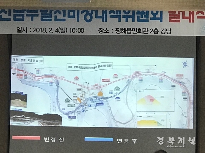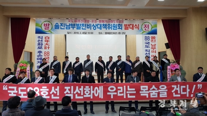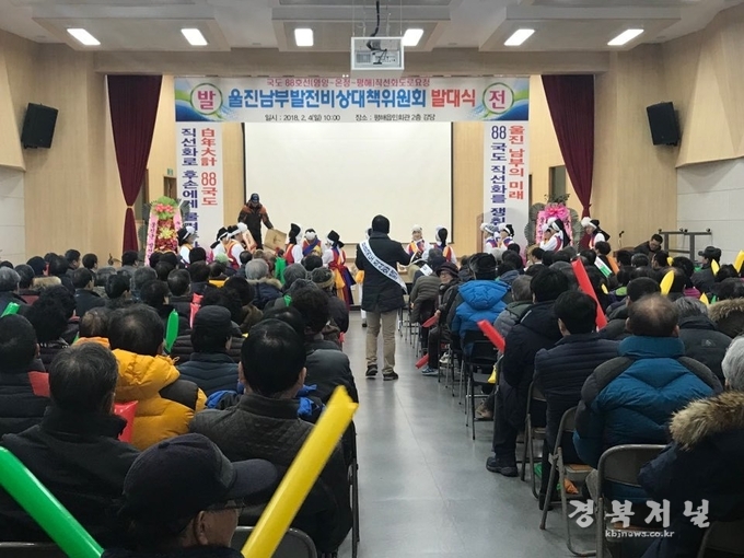[울진] 4일 오전 평해 읍민회관에서 국도88호선 영양~온정~평해 구간을 당초 직선화를 계획으로 추진하였던 광품 (1.1km지점)이 터널을 지나 기존의 (구)도로 구간을 경유하는 방식으로 변경됨에따라 이구간을 당초 원안돼로 직선화 해줄것을 요구하며, 울진 남부지역 4개읍면 [후포,평해,온정,기성] 주민 600여명이 모인가운데 비상대책위원회 [위원장:이세진] 발대식을 가졌다.