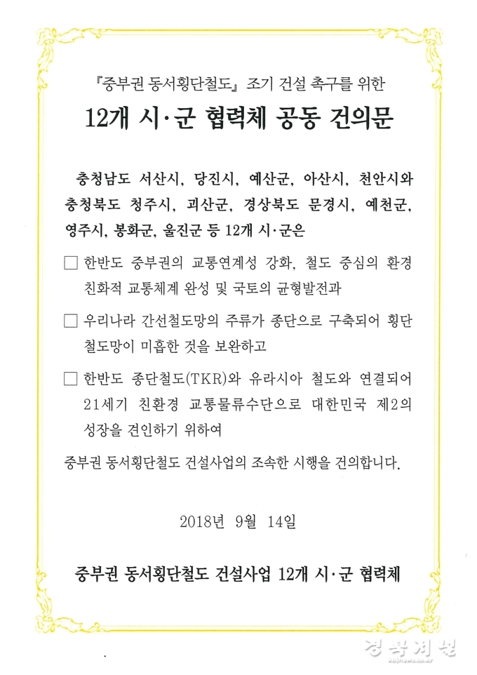 공동 건의문에서는 중부권의 교통연계성 강화, 국토의 균형발전, 종단위주의 철도망 보완, 유라시아 철도 연결 기반 등을 위해 중부권 동서횡단철도의 조기건설을 촉구하였다.