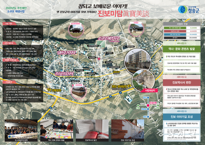 청송군(군수 윤경희)은 최근 국토교통부 주관 ‘2020년 소규모 재생사업’ 공모에서 “참되고 보배로운 이야기, 진보미담(眞寶美談)” 프로젝트가 최종 선정됐다고 밝혔다.