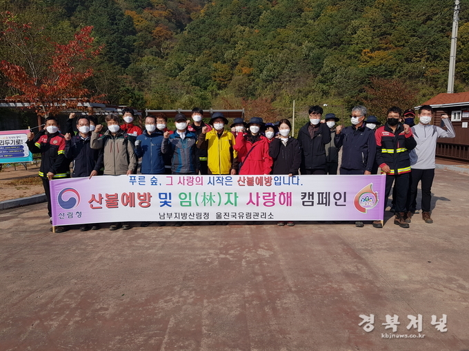 남부지방산림청 울진국유림관리소(소장 전상우)는 가을 단풍철을 맞아 산을 찾는 행락객이 늘어날 것으로 보고 산림 내 불법행위 근절을 위하여 2020.10.28.(수) 울진군 온정면 선구리 신선계곡 일원에서 직원 등 30여명이 산림정화와 임(林)자 사랑해 캠페인을 실시했다고 밝혔다.