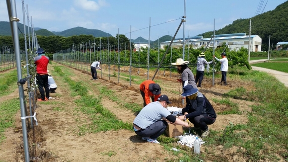 이날 농가를 방문한 직원들은 고품질의 사과를 생산하기 위해서는 웃자람을 방지하고 열매가 많이 달려도 찢어지지 않도록 어린 사과나무 가지를 묘목지주에 묶어주는 작업에 때이른 무더운 속에서도 일손을 지원하며 구슬땀을 흘렸다.