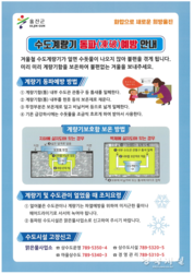 울진군 맑은물사업소는 본격적인 동절기 한파에 대비해 수도계량기 및 수도관 동파로 인한 주민 불편을 최소화하고자 대대적인 예방 홍보와 긴급 복구 대책 추진에 나섰다. 군은 오는 3월 15일까지를‘겨울철 수도시설 동파방지 대책 기간’으로 정하고, 상수도 분야 긴급 대책반을 운영한다. 대책반은 동파 사고 발생 시 신속한 복구와 비상 급수를 지원해 주민들의 생활용수 공급에 차질이 없도록 대응할 계획이다. 특히, 겨울철 동파 사고를 예방하기 위해 주민들에게 다음과 같은 행동 요령을 적극 안내하고 있다. 먼저 계량기함 밀폐 및 보온관리가 중요하다. 계량기함 내부의 수도관 관통구 등 틈새를 밀폐하고, 헌 옷이나 에어캡 등 젖지 않은 보온재로 내부를 가득 채워야 한다. 외부 뚜껑 부분은 비닐 등으로 덮어 찬 공기 유입을 차단하는 것이 중요하다. 또한 혹한이 예상되거나 장기간 외출 시에는 수도꼭지를 조금 열어 수돗물을 가늘게 흐르하는 소량 퇴수를 통해 관로 내 결빙을 효과적으로 예방할 수 있다. 아울러 계량기나 수도관이 얼었을 경우에는 50도 이상의 뜨거운 물을 바로 붓지 말고, 헤어드라이어의 약한 바람을 사용하거나 미지근한 물부터 시작해 점차 따뜻한 물로 녹여야 열손상(파