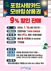 포항시는 오는 16일부터 2026년 카드형·모바일 포항사랑상품권(이하 포항사랑카드)의 첫 할인판매를 시작한다. 이번 할인판매는 연초 민생경제 회복과 활력 제고를 위해 선제적으로 마련됐으며, 230억 원 규모로 9% 할인 판매로 진행된다. 지역 골목상권과 전통시장에 활력을 불어넣을 수 있기를 기대하고 있다. 시는 올해 포항사랑상품권 발행 규모를 지난해 대비 500억 원을 확대해 총 3,500억 원을 발행하고, 상시(매월)는 포항사랑카드 9% 할인, 명절에는 포항사랑카드와 지류형 상품권을 10% 특별할인 판매한다. 상시 할인율은 지난해 상반기 7%보다 2% 더 혜택을 높였으며, 구매한도를 50만 원에서 40만 원으로 하향 조정해 보다 많은 시민들이 가계 혜택을 볼 수 있게 했다. 포항사랑카드 개인 구매한도는 40만 원이며, 보유한도는 70만 원이다. 시는 포항사랑상품권 발행으로 시민들과 소상공인 모두가 실질적인 혜택을 체감할 수 있도록 지역경제 선순환 구조를 한층 더 강화하고 연중 민생경제 회복에 힘 쏟는다는 방침이다. 이번에 진행하는 할인판매는 오는 16일 0시 15분 모바일 앱(iM샵)과 104개 판매 대행 금융기관 영업점에서 충전할 수 있다. 포항사랑카드는