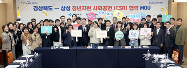 경상북도는 3월 5일 도청 사림실에서 삼성전자, 삼성물산과 함께 지역 청년들의 안정적인 정착과 자립을 위한‘경상북도-삼성 청년 지원 CSR* 협력’업무 협약을 체결했다. * CSR : 기업의 사회적 책임, Corporate Social Responsibility 이날 협약식에는 이철우 경북도지사를 비롯해 삼성물산 송규종 사장, 김홍락 상무, 삼성생명 이경민 고문, 삼성전자 정효명 부사장, 하헌재 상무 등 삼성 주요 임원진과 청년단체 대표 등 50여 명이 참석했다. 이번 협약은 1965년 삼성문화재단 설립을 시작으로 60년간 삼성청년SW, AI아카데미, 삼성드림클래스, 스마트공장, C-Lab Inside/Outside 등 사회적 책임을 다해온 삼성의 사회공헌(CSR) 활동과 연계하여 마련되었다. 경상북도의 행정적·재정적 뒷받침을 더해 지원체계를 보완, 확대하기 위해 마련됐다. * 삼성청년SW·AI아카데미(미취업 청년 대상 SW·AI 교육 및 취업지원) * 삼성드림클래스(청소년 학습 및 진로 멘토링 지원)* 스마트공장(중소·중견기업 삼성 기술 노하우 전파 및 스마트공장 전환 지원) * C-Lab Inside/Outside(스타트업 성장 지원) 협약에 따라 세