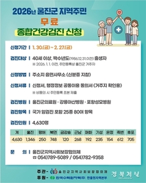 울진군은 한국수력원자력(주)의 지원을 받아 2025년에 이어 2026년에도 지역주민을 대상으로 종합건강검진을 실시한다. 이번 건강검진은 울진군 인구의 약 10%에 해당하는 4,630명을 대상으로 하며, 신청 기간은 1월 30일부터 2월 27일까지다. 신청대상은 2026년 1월 1일 이전부터 주민등록상 울진군에 거주 중인 군민 가운데 40세 이상(1986년 12월 31일 이전 출생자) 짝수년도 출생자다. 검진은 울진군의료원, 강릉아산병원, 포항성모병원에서 진행되며 검진 항목은 25종 80여 개 항목으로 국가암검진과 병행하여 실시한다. 검진을 희망하는 군민은 신분증을 지참하여 2월 말까지 주소지 읍면 사무소에 신청하면 된다. 신청서류는 신청서와 거주지 확인용(행정정보공동이용사전)동의서이며, 비동의시 주민등록초본을 제출해야 한다. 군은 2월 말까지 대상자 신청이 완료되면 3월 초에 한수원 지원 종합검진 미수검자, 고령자, 취약계층 순서로 대상자를 선정한 후 주민과 협약병원에 통보할 예정이다. 건강검진은 3월 16일부터 연말까지 진행된다. 울진군 관계자는“많은 울진군민이 종합건강검진으로 질병을 조기발견하여 평생건강을 유지하는 기회가 되기를 바란다”며“군민의 건강권