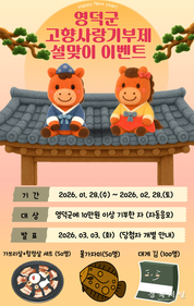 영덕군이 다가오는 설 명절을 맞아 고향사랑기부제 참여자들을 위한 특별감사 이벤트를 진행한다. 영덕군은 작년 경상북도 군부 가운데 고향사랑기부금을 가장 많이 모금한 지자체로, 이번 이벤트는 기부자들이 보내준 관심과 성원에 보답하고 고향사랑기부제 참여를 더욱 활성화하기 위해 이뤄졌다. 이에 이달 28일까지 고향사랑기부제에 참여한 기부자들에게 추첨을 통해 한돈 세트, 물가자미 세트, 대게 김 등 영덕군을 대표하는 지역 농·수·축산물을 답례품과 함께 추가 제공할 예정이다. 더불어 고향사랑기부제 참여자들에게 지급되는 답례품을 설 명절 선물로 활용할 수 있는 실속 있는 지역 특산품들로 구성해 기부자들의 만족도를 충족시킨다는 방침이다. 김옥희 재무과장은 “경북 군부 1위라는 성과는 영덕을 사랑해 주신 기부자 한 분 한 분의 소중한 참여 덕분”이라며, “그 소중한 관심과 지역 사랑이 모여 더 나은 영덕을 만들어가는 큰 힘이 될 것”이라고 전했다. 최선학 기자 kbnews7005@hanmail.net